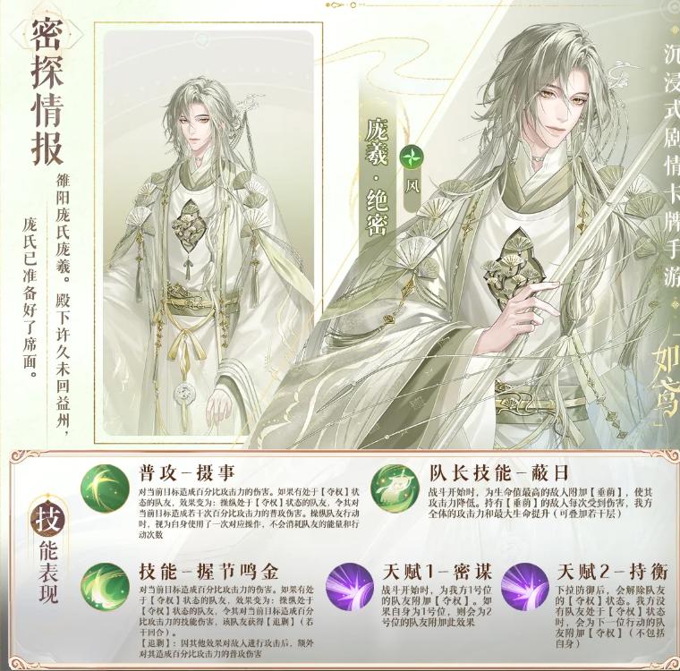 以上就是游戏的简单介绍,而大家对即将出现奖池的庞羲不了到时抽不抽。接下来小编来给大家一个建议,庞羲做为辅助密探,玩法围绕着夺权。夺权就是可以操控夺权状态的队友,使其进行额外的普攻或技能。可以使队伍节奏变得流畅,大家可以根据自己的情况来决定抽取。