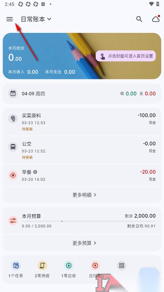 1.将手机上安装好的小星记账APP点击打开,在打开的页面上即可查看到顶部左侧显示的【三】图标按钮点击打开。