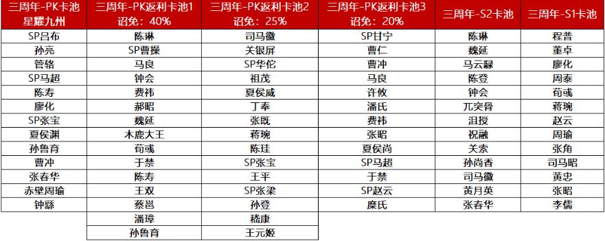 活动时间:4月9日10:00至4月19日23:59 完成指定任务可以领取周年专属纪念珍品装备等奖励,还能查看周年成就数据;限定武将「SP甘宁」永久加入名将招募卡池; 【注:可通过名将招募、求贤阁、客栈、寸积铢累等途径获得「SP甘宁」】 周年庆典 活动时间:4月9日10:00至4月19日23:59 活动期间全服主公通过完成「勤政为民」活动任务可以进行全服助力,全服助力值累加达到指定目标后可以领取招募信、锐城卫、周年头像框等奖励 周年签到 活动时间:4月9日10:00至4月19日23:59 累计登录签到即可获得SP曹操新立绘(S1/S2赛季为招募信)、名刺等奖励,最多可领取7天奖励 【注:「SP曹操」新立绘效果为增加本武将5%带兵量】 仙鹿寻踪 活动时间:4月9日至4月16日 每日22:00将全服随机抽取50名当日获得过「仙鹿的踪迹」的主公,赠送坐骑外观「仙鹿」 勤政为民 活动时间:4月9日10:00至4月16日23:59 活动介绍:每天完成指定活跃任务可以获得积分,积分达到一定目标即可领取活动道具「讨伐令」、「神秘的图纸」等奖励 保境安民 活动时间:4月9日10:00至4月16日23:59 活动介绍:每日消耗「讨伐令」可挑战限时关卡,挑战成功即可获得「神秘的图纸」等奖励 秘宝探寻 活动时间:4月9日10:00至4月19日23:59 活动介绍:使用「神秘的图纸」进行搜索有机会获得招募信、全典藏武将自选宝箱(S1/S2赛季为部分武将自选宝箱)等奖励 -全典藏武将自选宝箱(PK赛季):可从典藏·SP赵云、典藏·SP华佗、典藏·SP曹操等当前已经上线的全部典藏武将中任选1位; -部分武将自选宝箱内容(S1和S2赛季):庞统、赵云、吕蒙、徐盛、郭嘉、夏侯惇、貂蝉、袁绍任选1位; 投桃报李&结义同心 活动时间:4月9日10:00至4月19日23:59 活动期间,复制邀请码并分享给回归老玩家或新玩家,双方绑定后可获得金铢奖励,回归老玩家或新玩家完成获得名将任务后双方均可获得招募信奖励,每位主公最多可邀请绑定5名回归/新角色 限时卡包 活动时间:4月9日10:00至4月19日23:59 新增周年庆限时卡包(全赛季)和返利卡包(PK赛季) SP吕布武将信息 「SP吕布」群雄,7御,弓兵 战法:辕门天威,主动战法,冷却时间:1 -【主动】对范围内敌军造成兵刃伤害,同时消耗最多3层【辕门】,每消耗1层【辕门】,对其额外造成兵刃伤害; 【被动】自身造成主动伤害或受到伤害前,有一定概率(受面板武力影响)对目标施加1层【辕门】;同时有一定概率(受双方属性差影响)对自身圆形两格范围内统率最低的2名敌军造成兵刃伤害,每回合最多触发4次。 【辕门】:每次受到治疗或【护盾】时,有一定概率(受【辕门】层数影响)使其失效,上限8层,持续3回合。 传承战法:虓勇难制,主动战法,冷却时间:1 -【主动】对范围内随机敌方武将造成5次兵刃伤害,每次降低其统率,持续1回合。对同一目标最多命中3次。 缘分效果:太师动乱,美人连环,飞将所望 特性:威风、神射、一骑、扫荡、莽撞 神射:首回合普攻射程和远程战法射程加1 周年庆限时卡包图