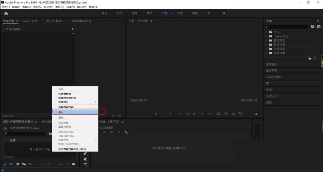 1、打开PR,导入视频素材。