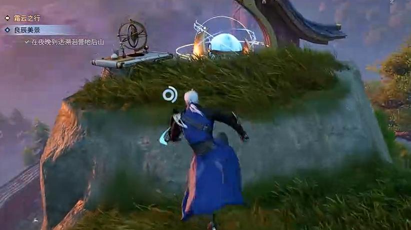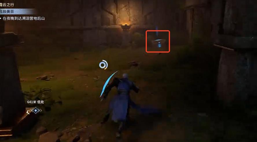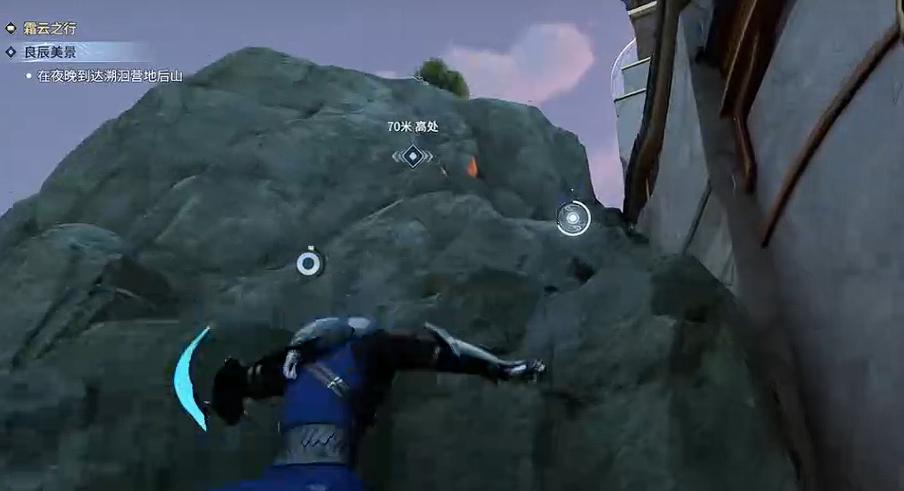 打开地图传送至溯洄营地大都市,朝蓝标山顶前进,可从营地外围墙用钩锁攀爬上山。