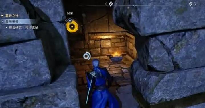 石碑碎片一共要收集三块,分散在附近几个地方。第一块在左侧建筑侧面的洞穴里,洞口有个标靶,打破标靶门就开了,进去拿就行。第二块在前方铁栅栏里面,这里要动点脑子,把蓝色石头牵引过去压住压力板,栅栏门才会打开。第三块最简单,直接在最上方的平台上,走上去拾取就好。三块碎片都拿到之后,回去把碎片安装拼接到石碑上,完成拓印,等NPC过来看完,再对话一次。