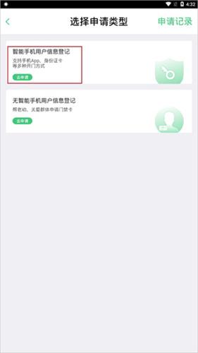 2、有两种申请类型,小编这里选择的是智能手机用户信息登记,包含支持手机app、身份证卡等多种开门方式,方便快捷: